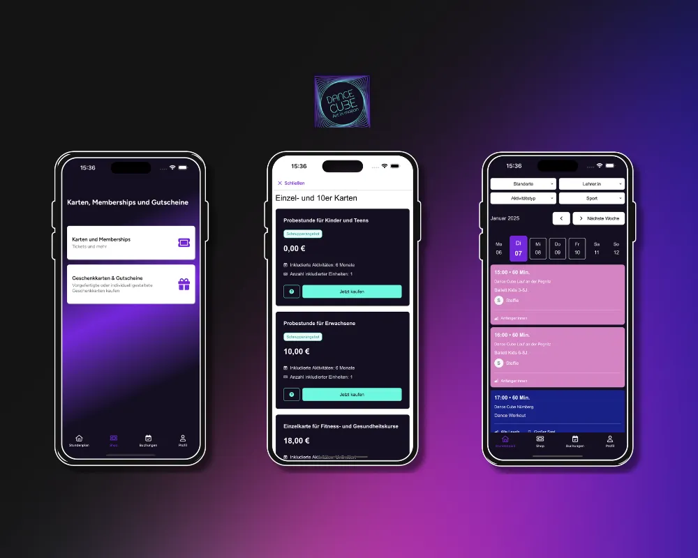 Das Studio Dance Cube hat ihre Eversports Branded App in jedem Detail an ihr Branding angepasst.
