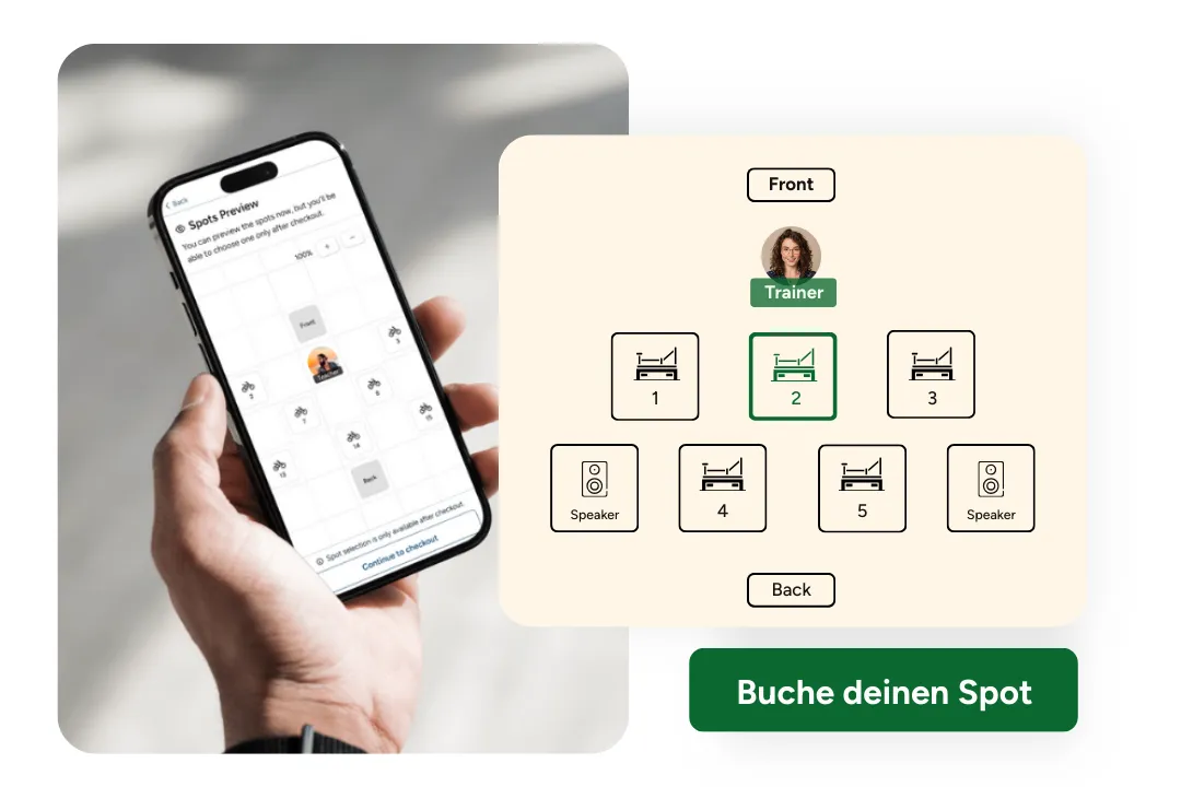 Die App unterstützt unser neues Spot Booking Feature. Deine Kund:innen können sich damit ihren Trainingsplatz im Studio schon vorab aussuchen.